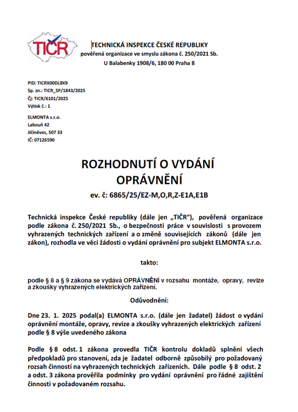 V současnosti, jsme držiteli několika živnostenských oprávnění a koncesních listin, zahrnujících prakticky veškerou elektrotechnickou a příbuznou činnost. Bylo nám uděleno oprávnění Technické Inspekce České republiky ev. č: 6865/25/EZ-M,O,R,Z-E1A,E1B k montáži, opravám, revizi a zkouškám vyhrazených elektrických zařízení bez omezení napětí.